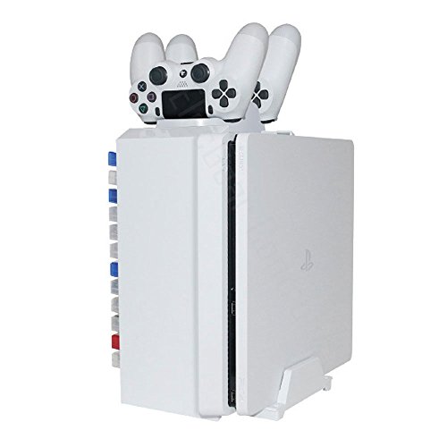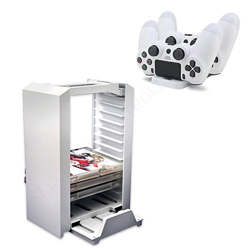 【3-in-1】12 slot for game disk storage, Universal display stand for PS4 /PS4 Pro /PS4 Slim - 3 kinds of Console and Dual Charger Dock for DualShock wireless controller. Elastic stand holds your console and keeps it in a vertical position