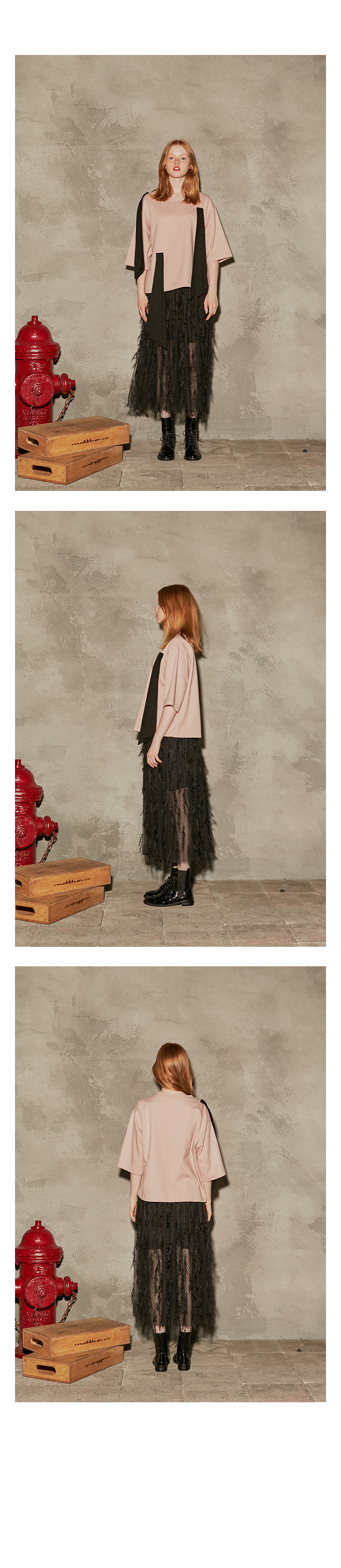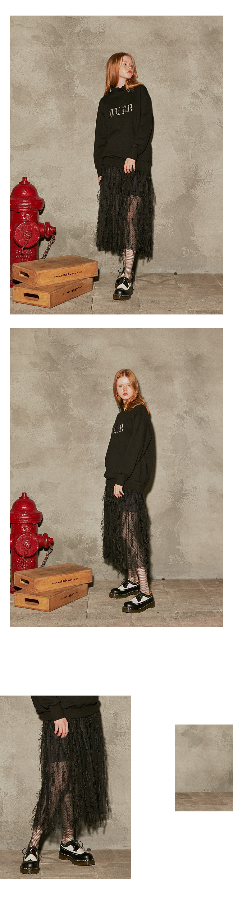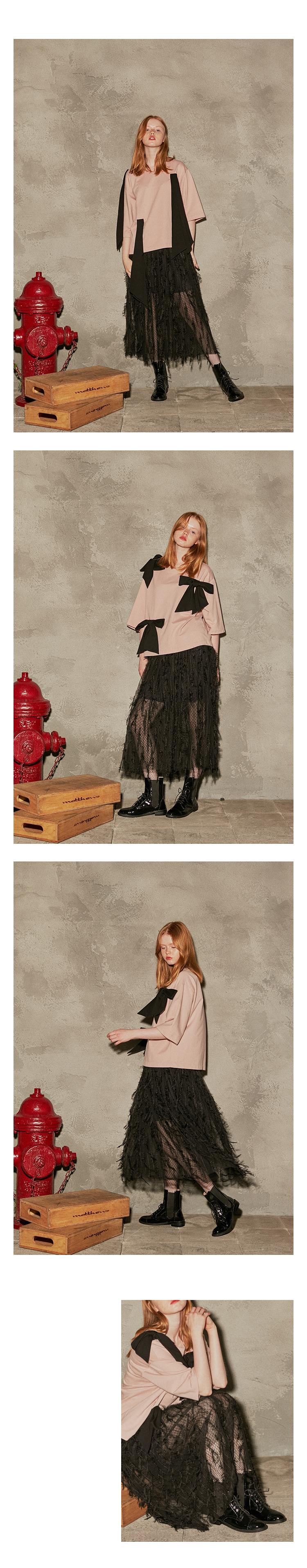 80년대 빈티지 무드를 깃털프린지가 달린 메시 소재를 사용하여 바디감은 심플하고 풍성하게 풀어냈습니다.
