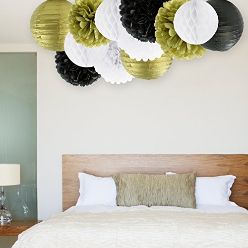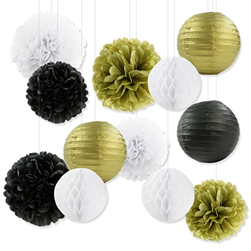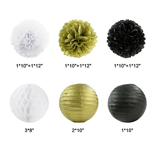 Package: 6pcs paper pom poms:2pcs white(1x10" 1x12"),2pcs gold(1x10" 1x12"),2pcs black(1x10" 1x12") 3pcs paper lanterns:2x10" gold,1x10" black 3pcs honeycomb balls:3x8" white 0
