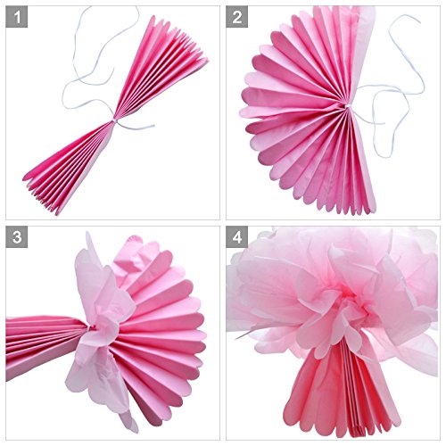 Instructions: 1.Make Sure the ribbon is tied in the middle of the paper. 2.Pull on each point of paper at one end of tissue, fluffing each point to the centre of the ball. 3.Please lightly tease it out and gently adjust the Pom-pom to make it looks full.