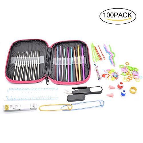 - 100 PCS CROCHET HOOK SET: 12 Silver Hooks, 10 Aluminum Crochet Hooks, 20 Locking Stitch Markers, 2 Stich Holders and other crochet accessories such as knitting measure ruler, stitch counters, stainless steel needle, needle point covers.etc to meet your different crochet needs.