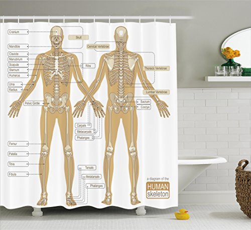 Human Anatomy Shower Curtain by Ambesonne, Diagram of Human Skeleton System with Titled Main Parts of Body Joints Picture, Fabric Bathroom Decor Set with Hooks, 70 Inches, White Tan