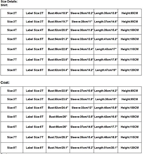 -. Feature : ☛: Material:Cotton Blended / ☛: Sleeve Length:Long Sleeve ; / ☛: Szie: 2T ; 3T ; 4T ; 5T ; 6T ; 7T ; 8T ; Pls read the size chart LEFT carefully before you place order / ☛: Season for Autumn, Winter and SP.R.Ing / ☛: Package include:1PC Shirt+1PC Pants+1PC Coat
