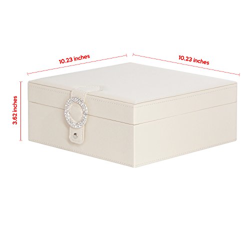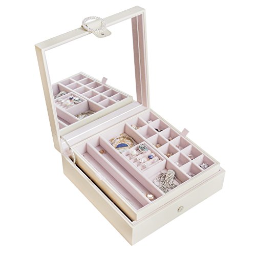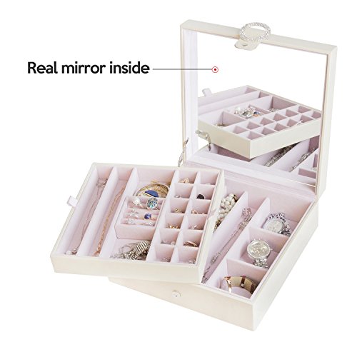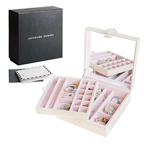 JackCubeDesign Leather 25 Sections Jewelry Storage Box Display Organizer Earring Bracelet Necklace Ring Watch Compartments Tray Holder Case with Mirror(Beige, 10.2 x 10.2 x 3.6)-MK356D