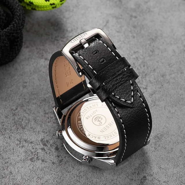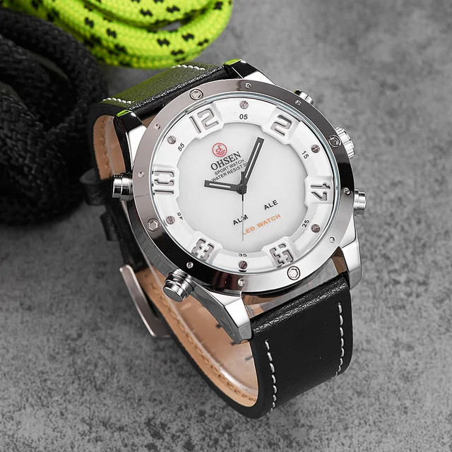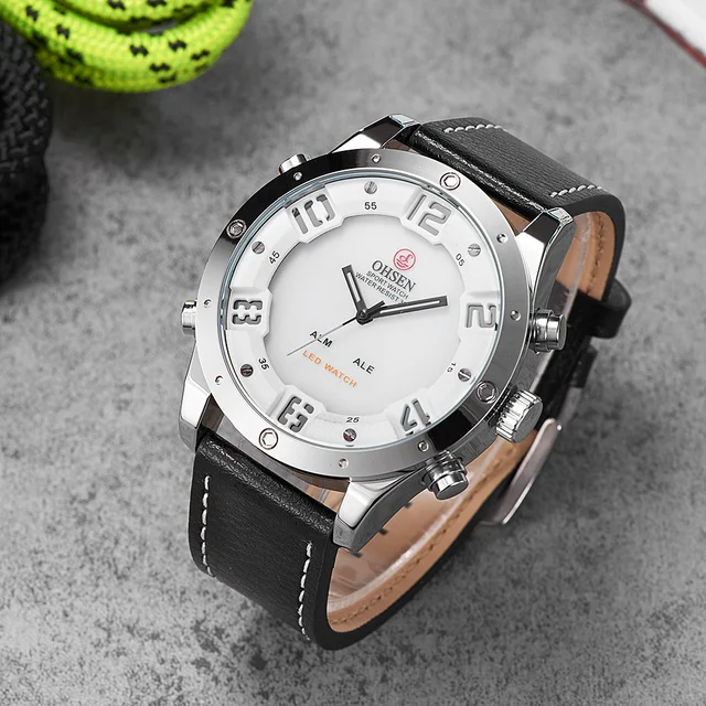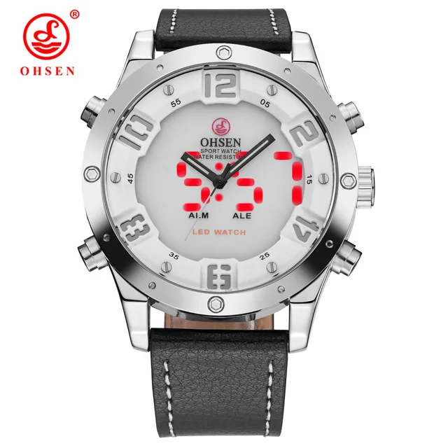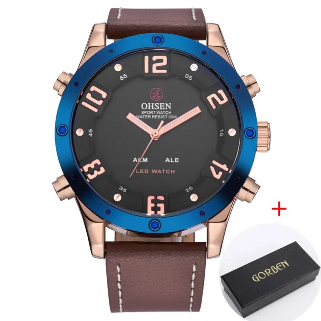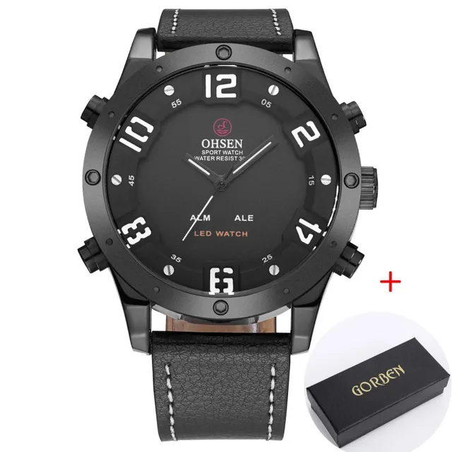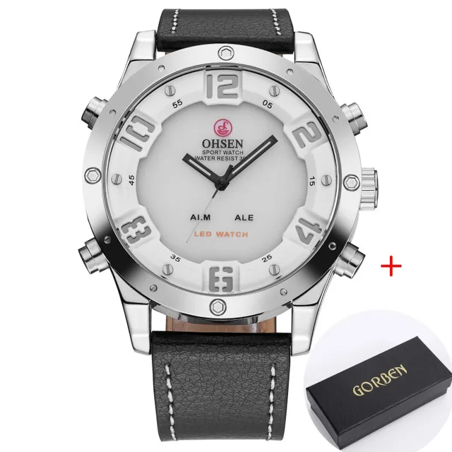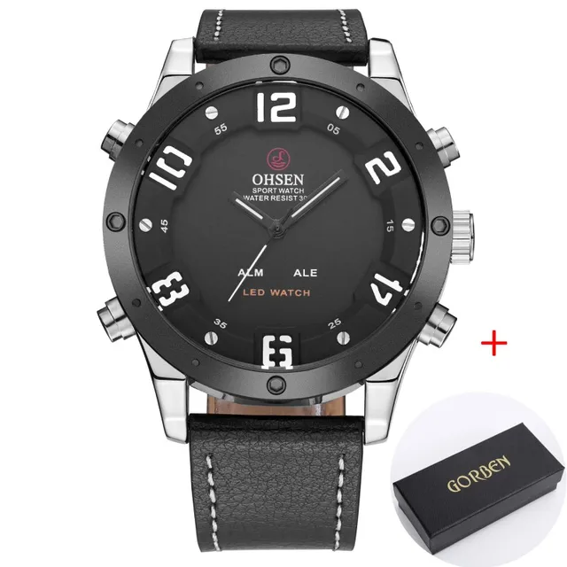 | [해외] OHSEN 듀얼 디스플레이 남성 시계 선물 상자 군사 방수 가죽 손목 시계 아날로그 디지털 시계 남성 relogio masculino |