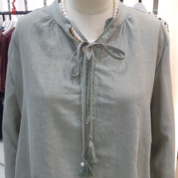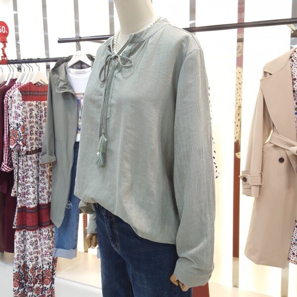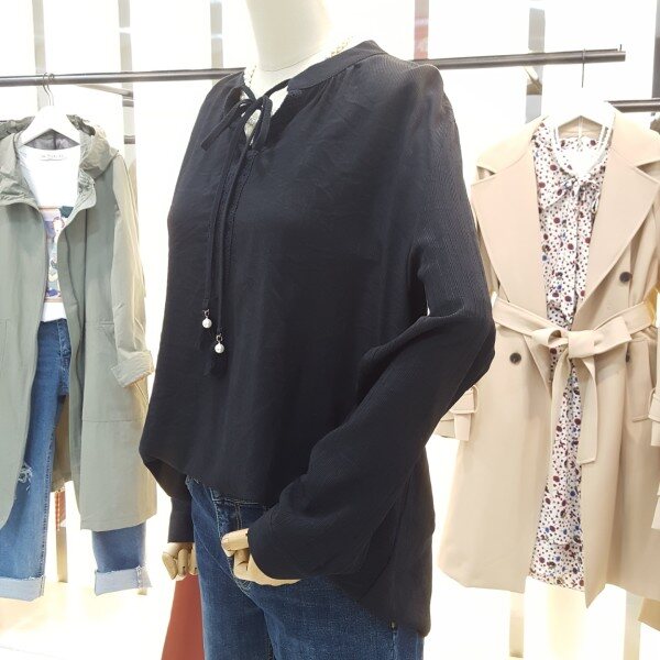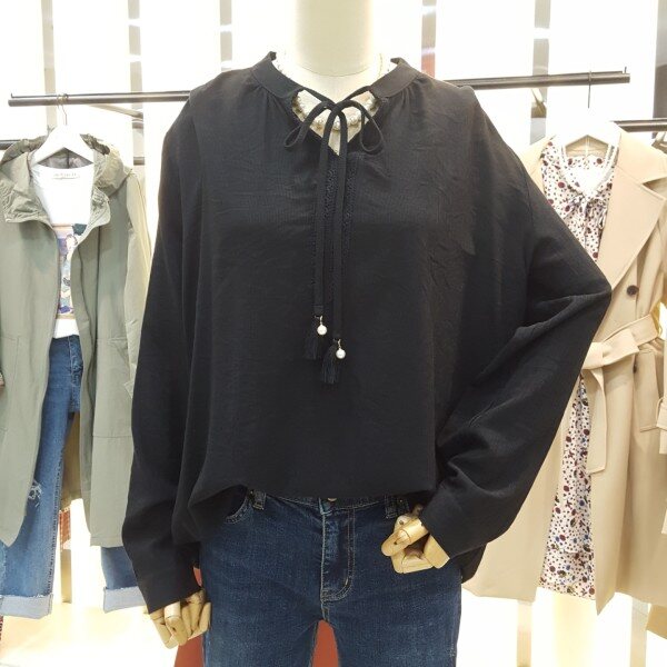 하늘거리는 소재감으로 여리여리한 스타일링을 연출할수있는 블라우스입니다.라운드와V형으로 넥라인에 자수패턴과 테슬끈으로 리본묶음을하여 러블리하게 착용할수있는 제품입니다.