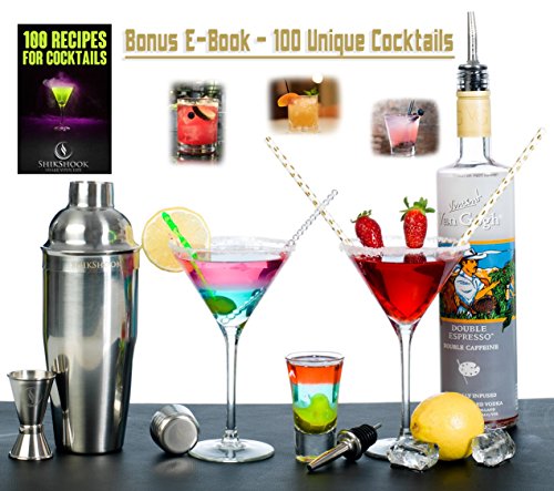 BEST OFFER - Great Gift ! Complete Bundle Set by SHIKSHOOK - includes a 3 Piece Professional Cocktail Shaker ( Drink mixer ) with a large 25 oz - 750 ml TIN that can hold up to three drinks + a Premium Double size 1oz & 0.5 oz Measurement Jigger + 2 Professional pourers + a Great digital eBooks with 100 Famous Recipes for Cocktails and Mocktails and everything you need to know about Bars and more. All this In a Lexury velvet bag perfect for travel! You don't need any further tools!
