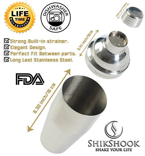 BEST QUALITY – SHIKSHOOK cocktail shaker kit not only looks Fashionable and desirable but has been Professionally designed to last a lifetime! ALL PARTS Built out of BPA-Free dishwasher safe ALL PARTS high-quality Stainless Steel, that is Guaranteed not to rust, leak or to loses quality properties in time. Built-in Strainer with a Perfect Seal