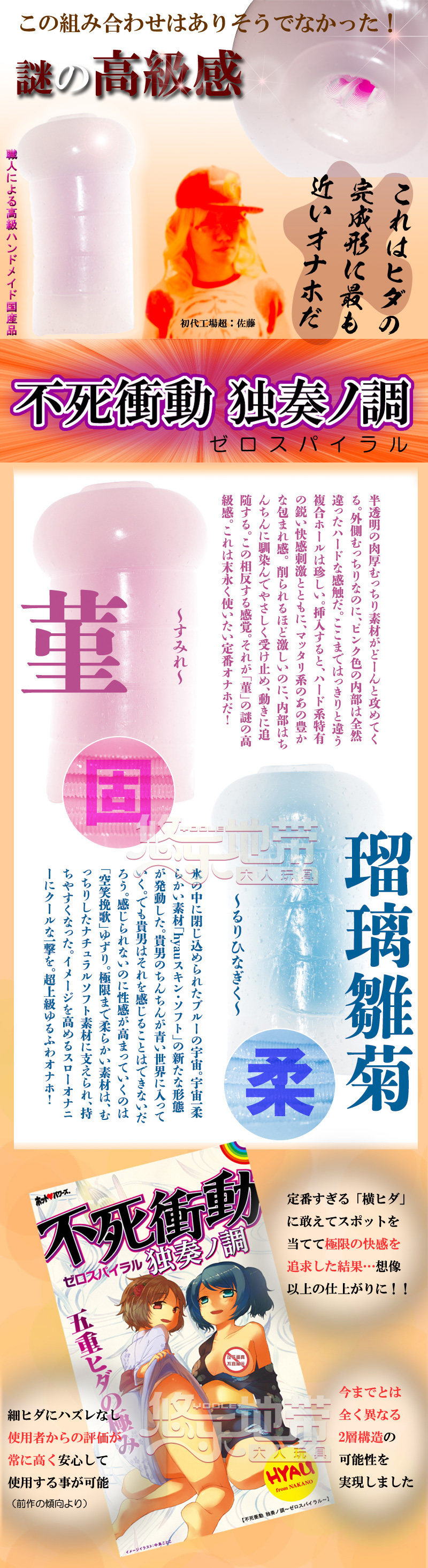 名器有太极,是生两仪 软与硬,两仪生四象 四肉柱,菫不死衝动的硬版,两仪之一,采用高弹物料所制造,重量接近710克!给予庞然巨物般的真实的实在感,透过双重构造,内部结构以四根充满凸横连接所成的凹坑,节节相扣,纹连纹不断,强力而又沉重的肉璧与你合二为一,在这肉肉的海洋之中,犹如大海中灯塔的四根肉柱,深深地为你烙下记号,紧紧地 深深地磨擦 啜著 贴服著你,无尽的刺激如大海波浪,接二连三,高潮不断。瑠璃雏菊不死衝动的软版,两仪之一,採用宇宙第一柔物料所製,随著双重构造,瑠璃雏菊 并非无穴,而是有实实在在的小穴,同样地以四条肉粒为主打,与 菫 不同的是,雏菊拥有宇宙第一柔物料所造出的肉璧,给予奇妙的黏贴感之馀亦令到肉柱更有南北两极极端的存在,两重的构造,对比之下,令你可以同时享受软的贴黏啜,硬的磨刮扣,爆射100分!