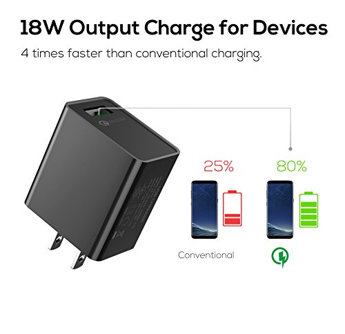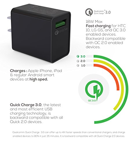 ADAPTIVE FAST CHARGER -------: With Ixir UL-Certified Qualcomm® Quick Charger 3.0 Adaptive Fast Charger your battery can go from zero to up to 80% battery level in about 35 minutes. 4 TIMES faster charging speeds than traditional methods and 38 percent more efficiency than Quick Charge 2.0. This powerful charger offers the fastest and most efficient charge for your beloved mobile device in the market. Charge up fast, even when in a hurry.