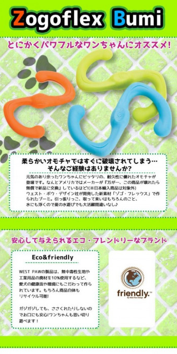| 元気のあり余ったワンちゃんにピッタリの、耐久性に優れたオモチャです。引っ張りっこ、取って来いはもちろんのこと、水にも浮くので夏の水遊びでも大活躍間違いなし♪ |