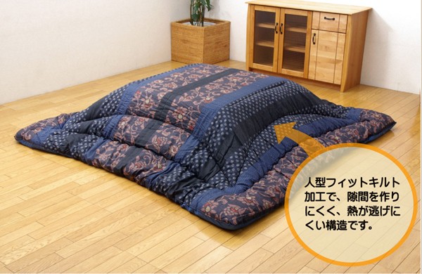和モダン柄のこたつ布団です。熱が逃げにくいフィットキルト加工を施しています。生地に撥水加工を施しています。生地には肉厚で張りと光沢のある綿素材を使用しています。こちらの商品は国内でプリント、綿入れしています。日本製のプリントらしい上質な質感と繊細な文様をお楽しみ下さい。部分暖房のこたつは電気代もおトクです。
