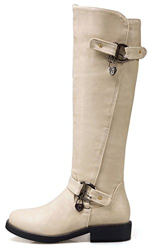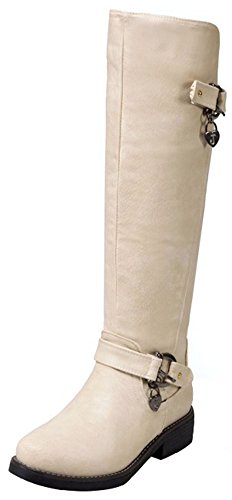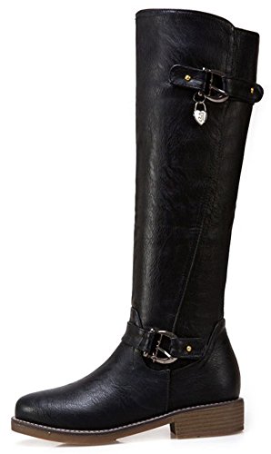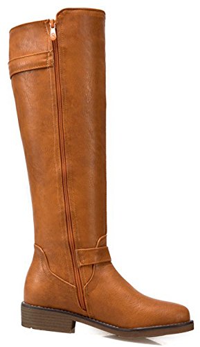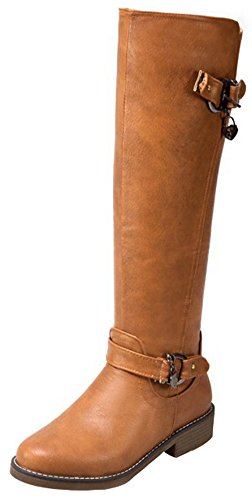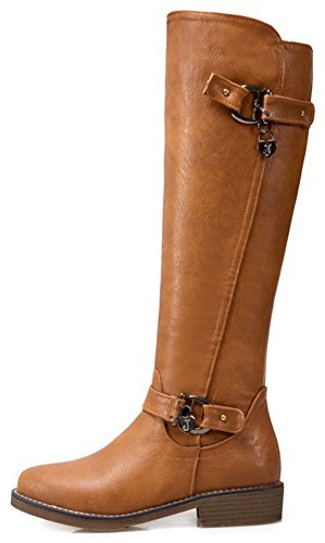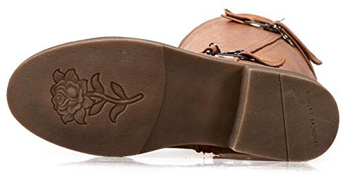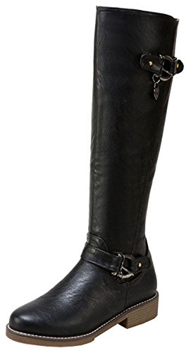 (Mofri)/Women's/Boots/DIRECT FROM USA/Mofri Women's Trendy Buckle Belt Round Toe Block Low Heel Side Zipper Mid Calf Riding Boots