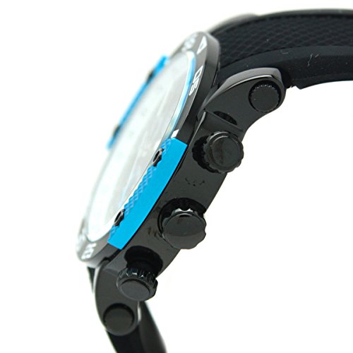 □ 케이스 소재:스테인레스(블랙IP도금)/□ 밴드 소재:실리콘 러버 밴드/□ 뒤개 소재:스테인레스/□ 방풍 소재:강화 크리스탈 유리(컬러 유리)/□ 방수 기능:100m방수/□ 무브먼트:쿼츠(일본제)/□ 사양:스톱워치 기능(1/10)고, 캘린더 표시(날짜)/□ 부속품:박스고, 보증서/□ 보증기간:메이커 보증1년