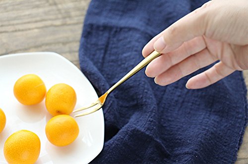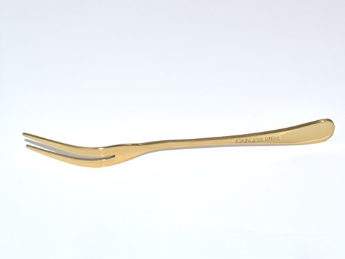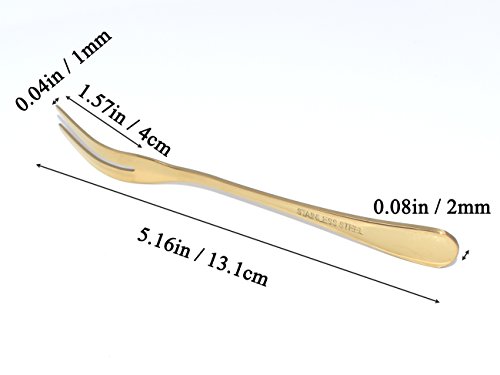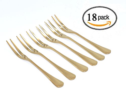 ROSE CREATE 18 Pcs 5 Inches Two Prong Forks Premium Stainless Steel Fruit Dessert Forks (Shining Golden) It is both peaceful and beautiful in its simplicity. Due to its understated appearance and discreet elegance, the cutlery is a harmonious addition to a modern decor. It can be combined in a variety of ways. GREAT FOR PARTY! Whether you are garnishing cocktails or making creative appetizers, our gold stainless steel dessert forks will show off your entertaining skills! Elegant and practical - these forks are perfect used for fruit, mini cakes,appetizers, olives, pastry, salad, or seafood QUICKLY-Hand cleaned to ensure no forge residue, Highly Polished Stainless Steel with Exquisite Lines,then hand polished and inspected to ensure you get only the best and most beautiful escargot forks on the market Light weight, yet surprisingly strong, these forks make great wedding or housewarming gifts. Stylistic Features: ? Modern length with balanced proportions. ? Carefully rounded edges for a pleasant feel. ? Can be combined in a variety of ways. ? Features: rounded edges at the end of the hand ? Premium stainless steel that will never rust ? Dishwasher safe Package Includes: * 18 x Dessert forks (5.1in / 13.0cm) 0