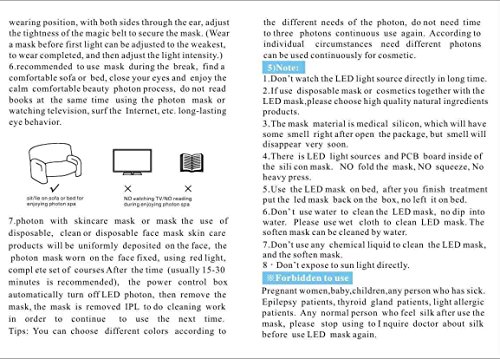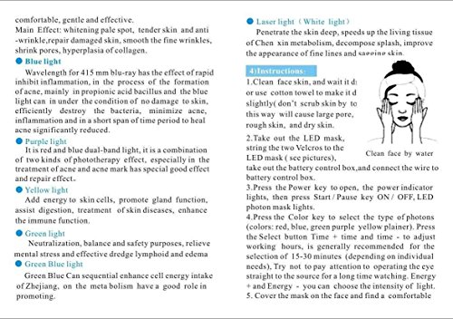 -. Feature : 7 Colors LED mask can solve stubborn skin problems,like heal acne and repair the acne scar. / Collagen Boosting and Skin Tightening,Reduce and prevent wrinkles, helps fight fatty areas. / The remote lets you adjust the intensity and the time. Adjustable mask size and a neck mask. / Use for about 20 minutes each day and can lessen your fine lines and wrinkle around your forehead and eyes in just 4-6 weeks. / The Photon Beauty Device, designed for facial beautification, uses natural light waves, which are transmitted by LEDs into the skin. The light activates photoreceptors in skin cells, producing energy for absorption by skin components, to beautify your complexion.