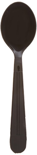The Baily HYB-IW/SS disposable heavy weight black plastic soup spoon is wrapped in clear plastic film for sanitation, and is suitable for use with soup, chili, stew, and other dishes. The spoon is black to coordinate with other black utensils and many tableware designs and decorations. It comes in a case of 1,000 soup spoons.