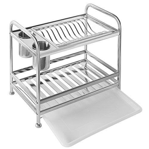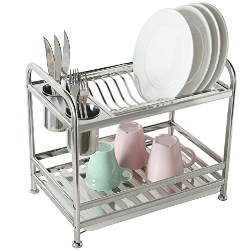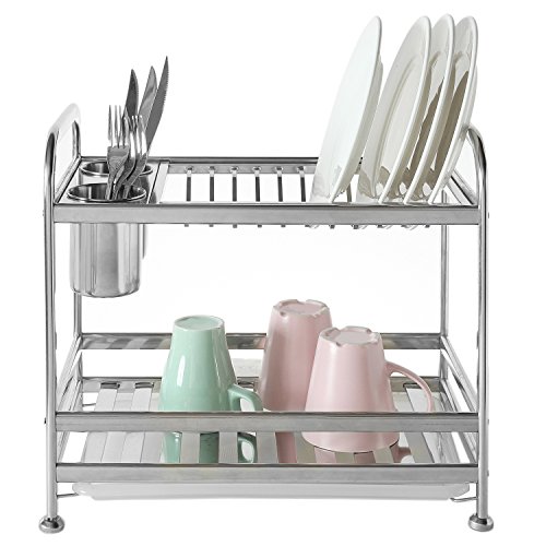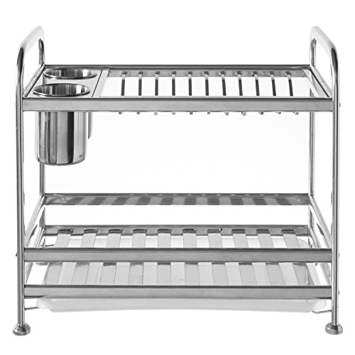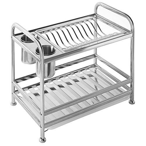 MyGift 2 Tier Freestanding Stainless Steel Kitchen Dish Air Drying Storage Rack with 2 Utensil Cups
