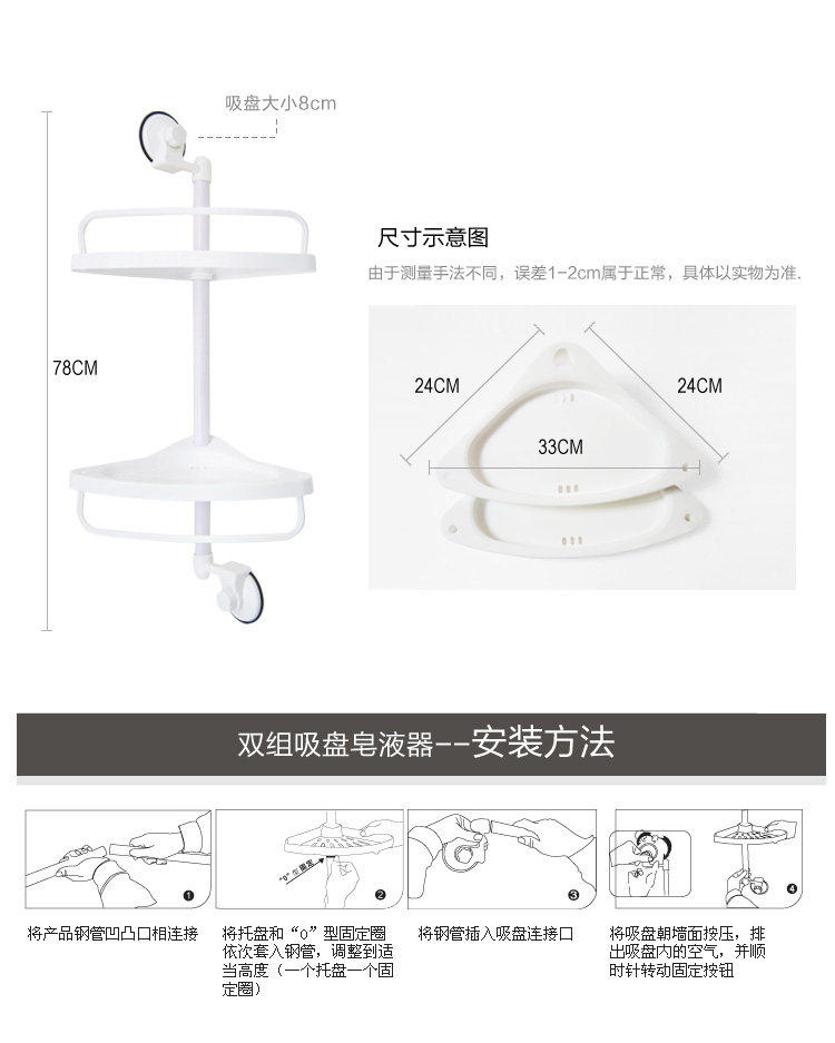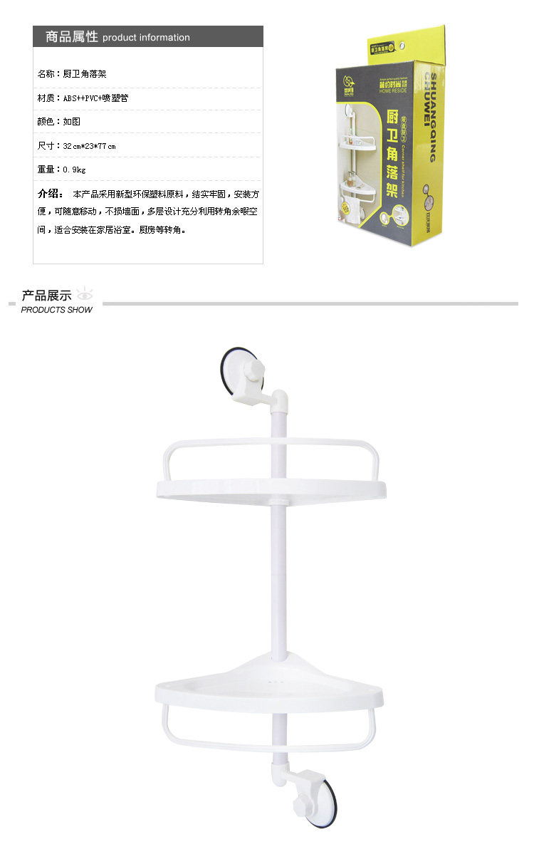 Commodity1 size: 32*20*75cm Commodity 2 size: 22.5*32.5*55cm Product overview: simple fashion? the perfect quality? is a new generation of kitchen goods. Overstrong suction cups? can be firmly adsorbed on the smooth surface. Double shelf? can receive various items placed a kitchen or bathroom? neat easy to find. A fence can prevent the goodsfall fall. A hanger can be hung the towel. Scope of application: the product is suitable for installation in the ceramic tile? glass? stainless steel? washing machine? metal paint? various othersmooth surface.
