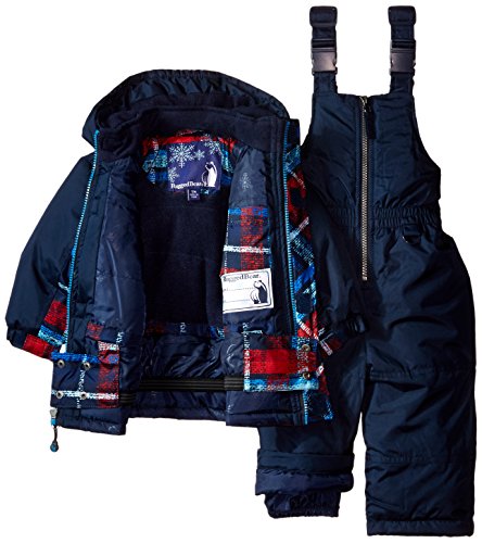 Two piece snowsuit set. All over plaid printed ski jacket and solid color snow bib.