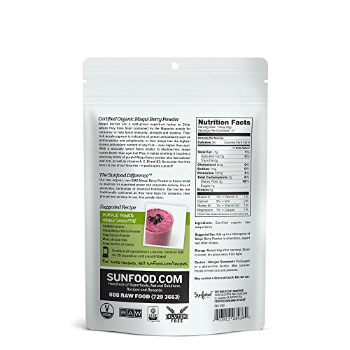 Certified Organic Maqui Berry Powder - With a deep berry flavor similar to blackberries, maqui berries are a wild-grown superfruit native to Chile. There, the Mapuche people have been consuming maqui for centuries to help boost strength and stamina. The rich, purple pigment of this amazing fruit indicates the presence of antioxidants such as anthocyanins and polyphenols. Maqui berries also have calcium and iron, as well as vitamins A, C, B1 and B3. This little berry packs a lot of punch! The Sunfood Difference - Our raw, organic, non-GMO maqui berry powder is freeze-dried to maintain its superfood power and enzymatic activity. Free of pesticides, herbicides or chemical fertilizers, the berries are traditionally cultivated as they have been for centuries, then ground into an easy-to-use, fine powder form.Feature