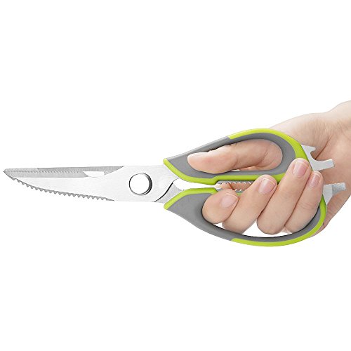 - ✂ THE SHARPEST DISHWASHER SAFE KITCHEN SCISSORS - our professional ultra sharp heavy duty scissors made of heavy duty stainless steel cut anything in Your kitchen – poultry bones, turkey, barbecue (bbq) meat, skin, fat, cooked and raw meat, fish, chicken, herbs, fruits, vegetables, seafood, crab, other food, but also paper, bubble wrap, plastic etc. High quality top grade stainless steel makes poultry shears anti rust, corrosion resistant and dishwasher safe.