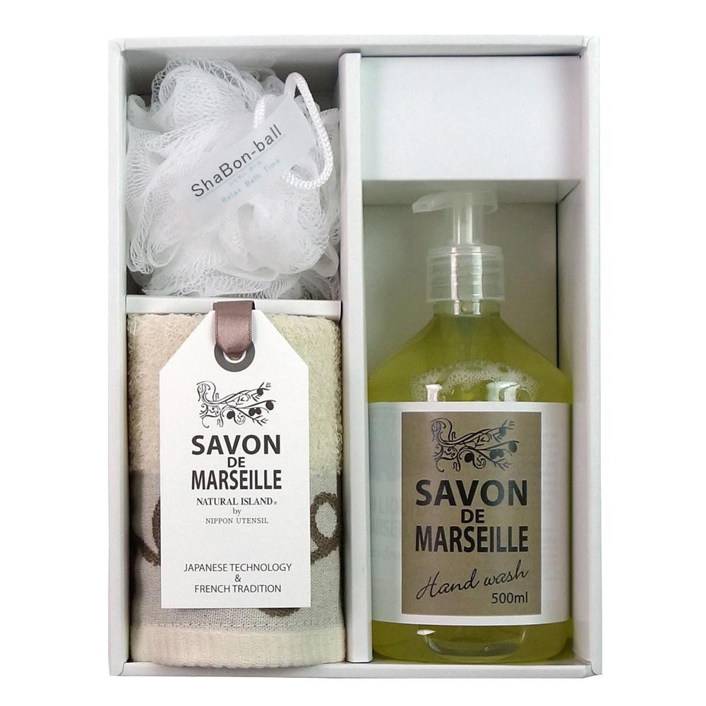 フランスのマルセイユで作られた植物性の石鹸と有機精練イソフラボン加工を施したタオルを組み合わせたギフトです。 |