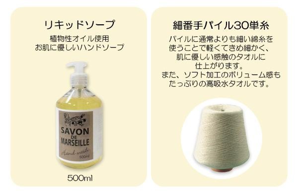 | フランスのマルセイユで作られた植物性の石鹸と有機精練イソフラボン加工を施したタオルを組み合わせたギフトです。 |