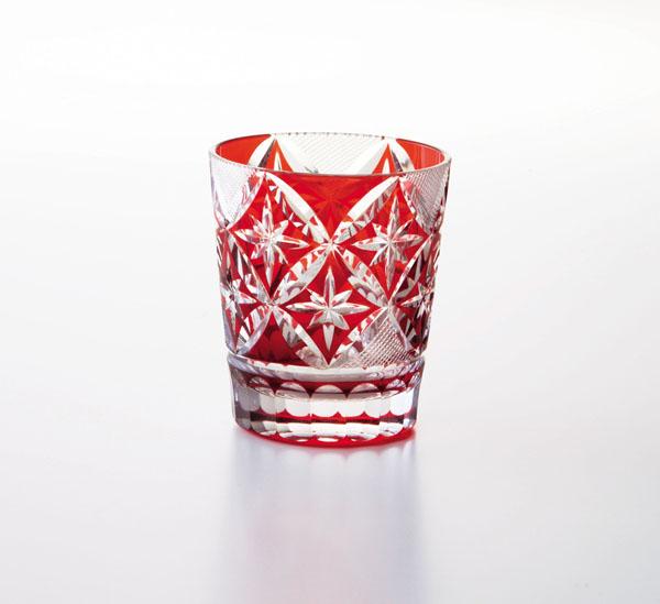 クリアなグラスに色硝子を被せハンドカットを施した色被切子のフリーカップ。伝統的な七宝紋様をアレンジしたカット柄が魅力!化粧箱入りですのでプレゼントにピッタリです。