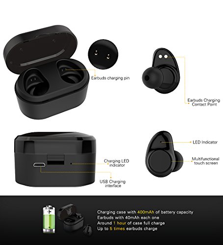 PORTABLE CHARGING AND POWERFUL BATTERY: Charge the earpieces for 1 hour in box. Provide up to 2 hours of music time. The charging case can charge 5 times for earbuds. It's also can be used to charge your phone.