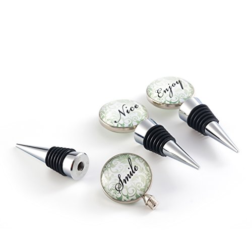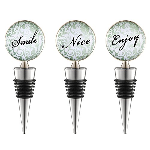 -. Feature : SET OF 3 DECORATIVE WINE BOTTLE STOPPERS - Store your wine with style with these bottle stoppers, featuring 3 glass designs to add joy to your table: Smile, Nice, Enjoy / FRESH WINE FOR LONGER - These stoppers are designed to preserve your favorite wines using an airtight and leak proof seal. No aftertaste or oxidation / FDA APPROVED - There are many wine stoppers out there but very few have been approved by the FDA to show they are safe to use with food/drink products. Our wine stoppers are FDA approved / EASY TO SET AND REMOVE - Just insert into the bottle opening, apply some pressure so the stoppers is tight inside, and you are ready to store your wine. To remove just lightly wiggle the stopper until it removes. Wash stoppers and reuse several times. / SATISFACTION GUARANTEED - If you are not 101% satisfied we will make it right for you, no questions asked and risk free