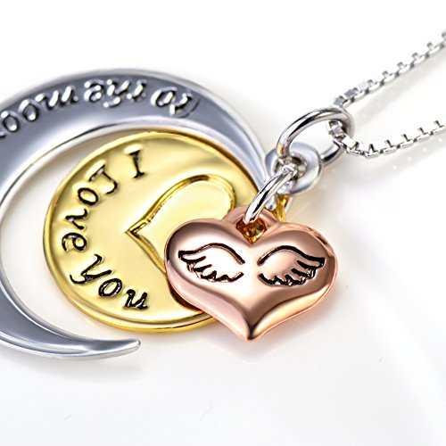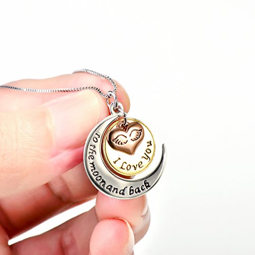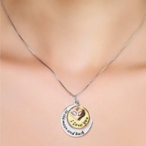 Sterling silver necklace featuring three-piece moon pendant engraved with loving message of "I love you...to the moon & back"