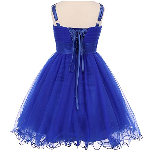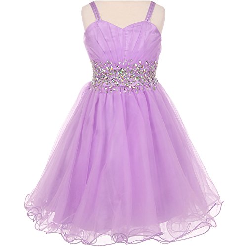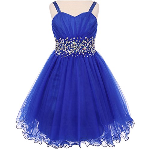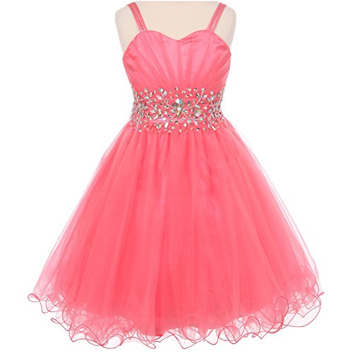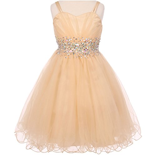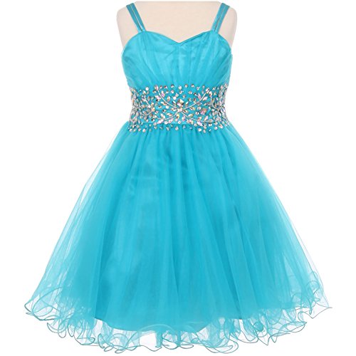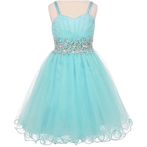 Fabulous tulle wired dress perfect for any special occasions. The dress features pleated bodice with stunning AB stones on the waistline and spaghetti corset style on the back for perfect fit. Knee length for adorable look. Available in 7 color options and size 4 - size 16.Feature