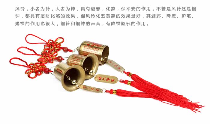 In feng shui , the role of copper bells can be restrained five yellow evil . Where fleeting five yellow flew the gates, doors , should be linked to copper wind chimes defends . Because of five yellow evil territory , so to hang a gold copper wind chimes can vent rustic. Golden bells swing can enhance the gas , the gas vent five loess shake- gold evil . Ancient bells with evil, defends , the role of security and peace , whether or bell chimes , Lucky defends have effect, but chimes of five yellow evil best, its evil, fell monsters , nursing home, thanks Fu is also a great role , bells and bell sounds, there is blessing evil role. Also commonly used in feng shui items . Bells, small ones for the bell , the big bell , with evil, defends , the role of security and peace , whether or bell bells , Lucky defends have effect, but five yellow bells of the most evil effects well, is commonly used in feng shui items . chimes for two of the five yellow , black or commonly used in the car, can be evil defends reduce accidents due to poor fierce disaster caused by the gas field . Wind chimes, small by Bell , the big bell , with evil, defends , the role of security and peace , whether or bell chimes , Lucky defends have effect, but chimes of five yellow evil best, its the role of evil, fell monsters , nursing home , is also a great blessing , bells and bell sounds, there is blessing evil role. Also commonly used in feng shui items bell decorations can be hung , it is refreshing and clear crisp sound ; able to get rid of the demons to defuse worries and difficulties cited fiscal defends evil spirits living fiscal front of the store for the fiscal hung career. . . . . well - plenty of money , and resolve all damage ; .. resolve the matter ... is a feng shui mansion changed to allow the magnetic field to resolve the evil spirits of the home feng shui can achieve the effect of good fortune Lucky , so be content with the financial position or evil bit . Collection is also available in a cornucopia . Two of the five yellow fleeting Heisha also has a unique effect, bad luck or lack of gold hungry Jin row of bad luck , they can knock off bells to bad luck .