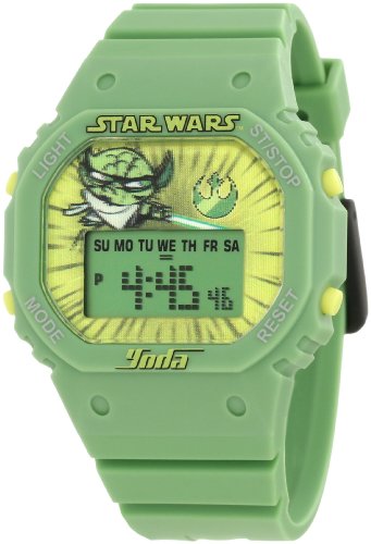 The Star Wars Kids' Yoda Digital Watch is a stylish kids watch with an LCD display and features Yoda in a Star Wars image with a neat 3D effect. This cool green watch has a matching strap while the digital display with an EL backlight makes it easy to read the time, even in the dark. Learn well will you as you tell time with Master Yoda and with the Star Wars Kids' Yoda Digital Watch.