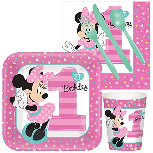-. Feature : Includes 8 dessert plates and 9 oz. cups, 16 beverage napkins, and 8 forks and 8 spoons. / Add matching tableware, favors, accessories, or a party kit bundle to complete your birthday party! / Make your little one's 1st birthday one to remember with Minnie Mouse.