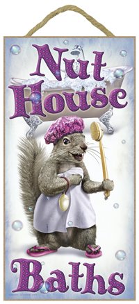 (SJT21518) Nut House Baths (squirrel in shower cap and flip flops) 5" x 10" wood plaque, sign - Features the artwork of JQ Licensing