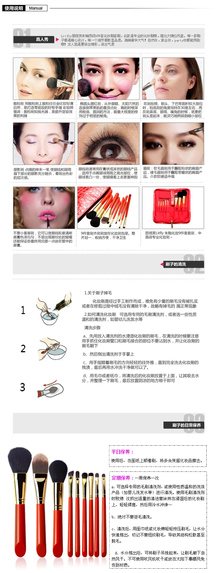 散粉刷 总长约16cm,毛长约4cm, 优质羊毛腮红刷 总长约16cm,毛长约3.5cm 优质羊毛粉底刷 总长约15.5cm,毛长约3cm 进口尼龙毛眼影刷 总长约13.2cm,毛长约0.9cm 小马毛平头眼线/眼影刷 总长约13.4cm 毛长约0.6cm 小马毛精细眼线刷 总长约12.5cm,毛长约0.5cm 进口尼龙毛遮瑕刷 总长约12.8cm,毛长约0.8cm 进口尼龙毛唇刷 总长约12cm,毛长约1.0cm 小马毛眉刷 总长约13cm,毛长约1cm 獾毛(貉子毛)