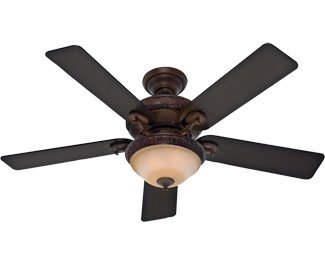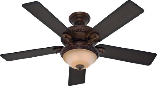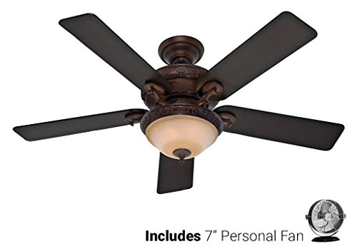 Studio : Hunter Fan Company Publisher : Hunter Fan Company Product Description The Hunter 53029 Vernazza collection 52" indoor ceiling fan (with fan light pull chain control and light) in Brushed Cocoa brings Traditional style. This fan includes Five Reversible Aged Barnwood / Rustic Lodge Blades and the hanging height is 20.5". The voltage is 120 volts. The Hunter 53029 down light requires 2 bulbs (included). Additional Information: Control - Three-speed pull chain and on / off light pull chain with manual reverse switch on motor; Downrod - Includes 3" (3/4" Interior Diameter) Pole; Glass - Amber Gradated Cocoa Glass. Includes Hunter 7 Inch Personal Desk Fan in Brushed Nickel Finish. 0