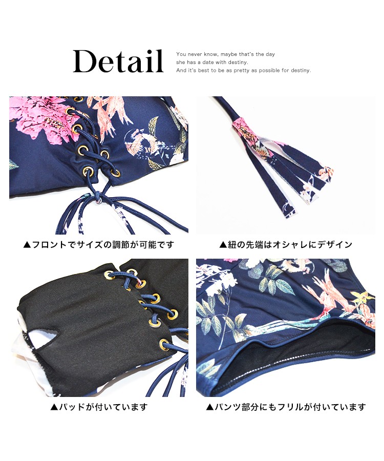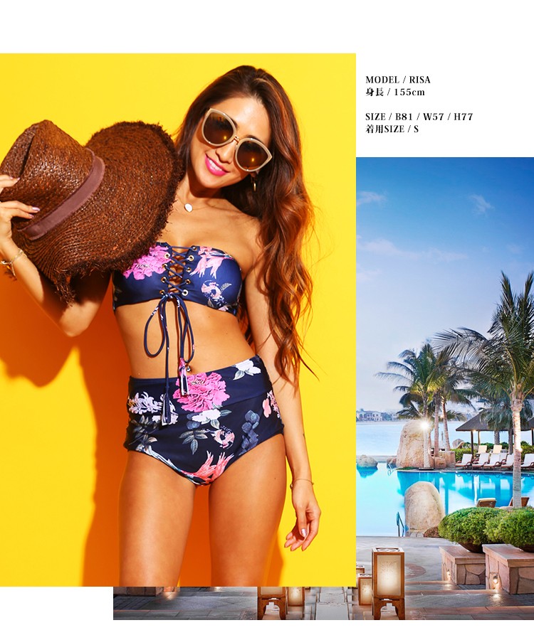 | 商品特徴 | LAVIA(ラヴィア)から新作のプチプラ水着が入荷しました。インポート感たっぷりのお洒落なバンドゥタイプの水着が登場です!引き締まって魅せてくれるネイビー地にトレンドのボタニカル柄でcool beautyに!胸元のレースアップデザインが大人セクシーな一枚です。パット、パットポケット付きとなっております。 |
