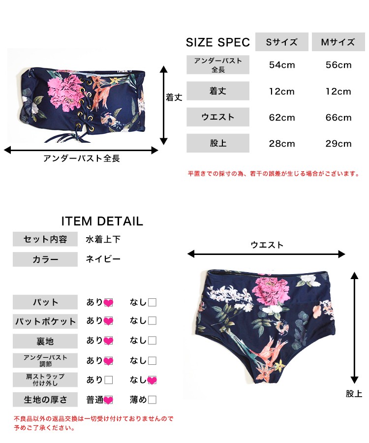| サイズ | [S] アンダーバスト全長:54cm 着丈:12cm ウエスト:62cm 股上:28cm [M] アンダーバスト全長:56cm 着丈:12cm ウエスト:66cm 股上:29cm |