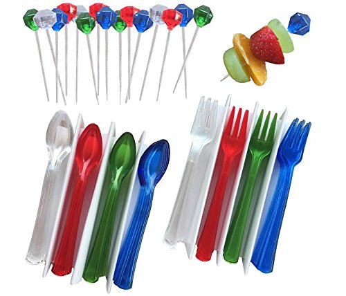 Outside the Box Papers Appetizer Kit with 16 Jewel Tone BPA Free Plastic Picks, 24 Mini Forks and 24 Mini Spoons -Blue, Red, Green, Clear