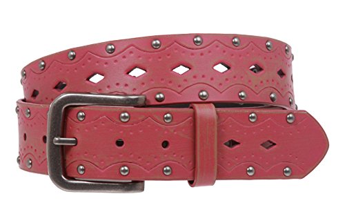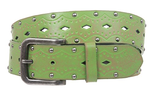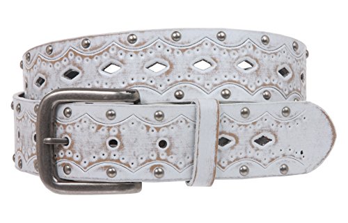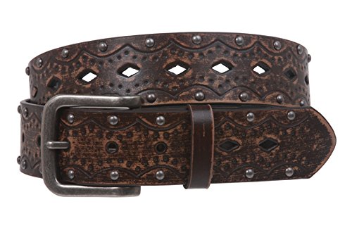 Studio : Beltiscool Publisher : Beltiscool Binding : Apparel Product Description -This vintage looking belt features embossed flower with cut-out pattern down the center and two rows of antique silver studs along the edges.The buckle is removable with snap on feature which allows you to switch most buckles. -Material: Bonded Leather -Width: 1 1/2" -Belt Size is measured from where the leather ends at the buckle end to the middle hole at the tip end -Size Chart: |S/M - 32", buckle prong to center hole; |End to end: 38" |M/L - 36", buckle prong to center hole; |End to end: 42" |L/XL - 40", buckle prong to center hole; |End to end: 46"