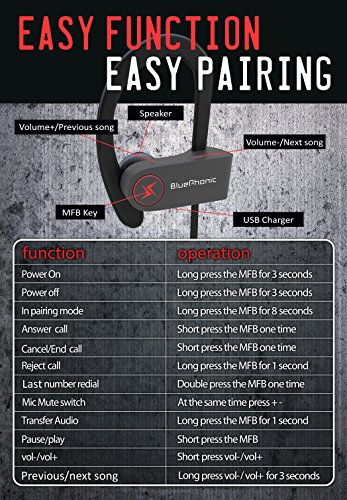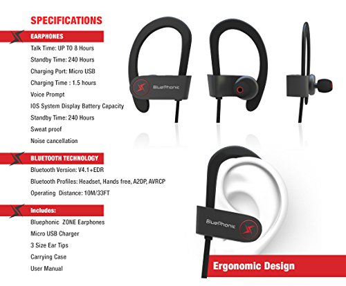 -. Feature : FANTASTIC AUDIO PERFORMANCE + BUILT IN MIC. Zone Bluetooth Stereo Eeabuds with volume control have CVC6.0 noise cancelling technology to reduce the background noise and HD beats technology + EDR Audio technologies deliver astonishing acoustics with deep bass. We are sure that you will get amazed with its deep bass and high definition sound quality. / COMFORT AND STYLISH WEARING. Thanks to its flexible ear hooks secure fit ear buds, Zone Wireless In-Ear Headphone are comfortable to wear, perfectly fit and remain stable in your ears while you are doing your favorite exercises. Also, it is lightweight and perfectly matches with any of your favorite outfits. This Stereo wireless over ear headphone is suitable for running, climbing, dancing, jogging, driving, skating, camping, fishing and any other indoor or outdoor sport activity / UNIVERSAL COMPATIBILITY WITH ULTRA LONG BATTERY LIFE. Zone Sport Bluetooth Headphones guarantee simple, fast & super easy pairing with your Samsung Galaxy s3, s4, note 2 or tab 2, HTC ,LG and Nexus smart phones, Bluetooth headset for iPhone 4s, iPhone 5,iphone 6 and iPhone 6 plus , iPad or any other Bluetooth enabled device. With its powerful and fast recharging battery, you can enjoy super long 8 hours uninterrupted play back time at maximum volume, which is equal to a full week of workouts / A MUST HAVE PACKAGE - Bluephonic sport earbuds- Universal micro USB charger - 3 Size ear tips - luxury Travel case - manual guide - 100% SATISFACTION GUARANTEED! you may have been disappointed by other cheap wireless earphones, but we guarantee that Zone Bluetooth Stereo Headsets won't let you down! click "ADD TO CART" Button & place your order with complete peace of mind. grab our special bonus, a High quality & durable carrying case for your Zone headphones absolutely free with every purchase!