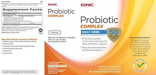 Potency Guaranteed Clinically Studied Multi-Strain Formula For Daily Probiotic Support May Provide Digestive & Immune Support Why Gnc Probiotic Complex 50 Billion? Multiple Strains Of Live, Active Probiotic Cultures Prebiotic Fos Guaranteed Potency Through Expiration Date No Refrigeration Necessary Gluten Free Lactose Free