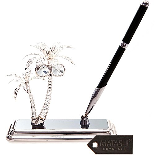 - EYE-CATCHING DESIGN: A twist-to-open crystal topped pen rests in a swiveling holster, on a Silver inlaid base. Alongside, sits an ornate Silver Palm Trees Pen Set figurine. Crafted with quality materials like tarnish-resistant Silver, and precision cut Matashi® crystals.