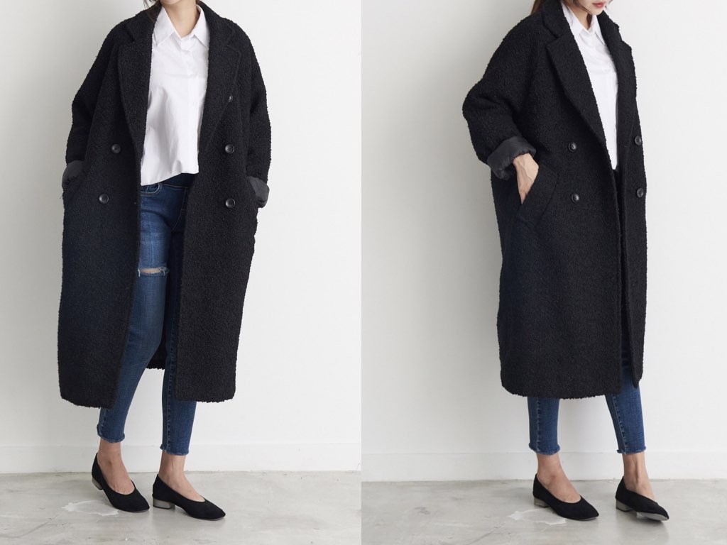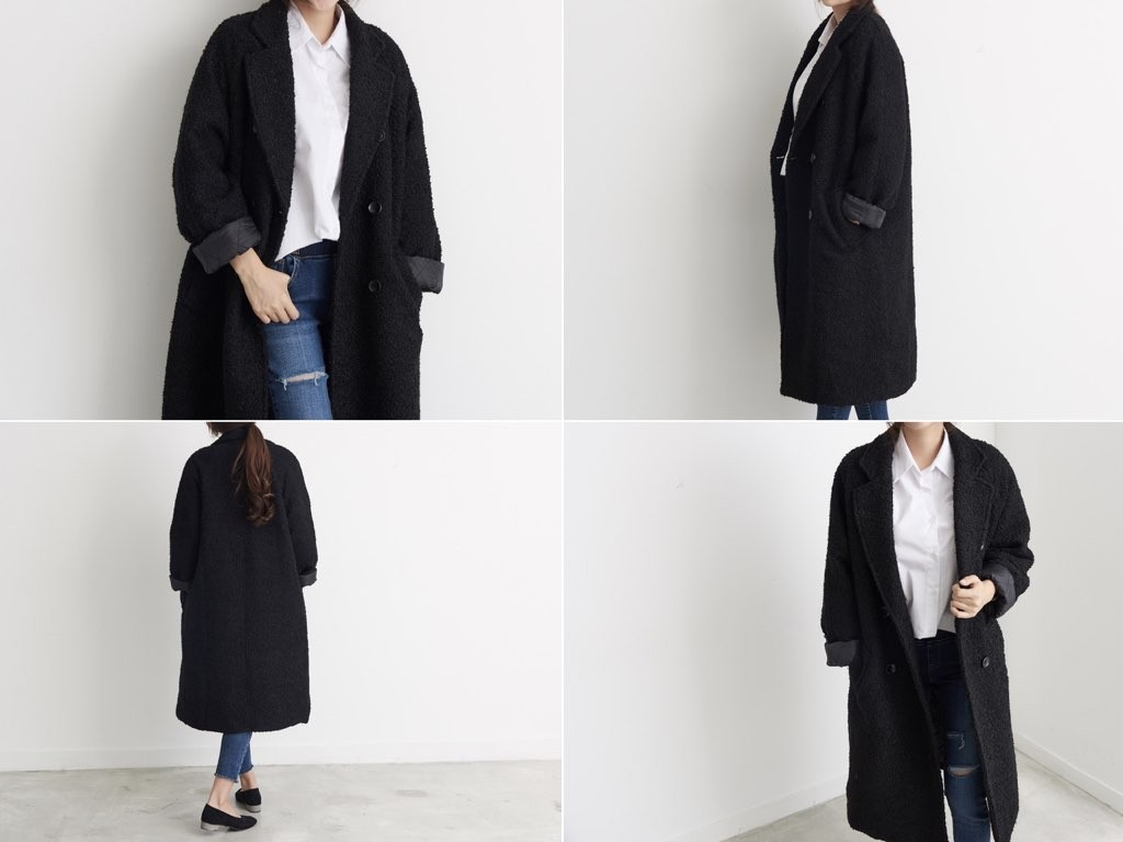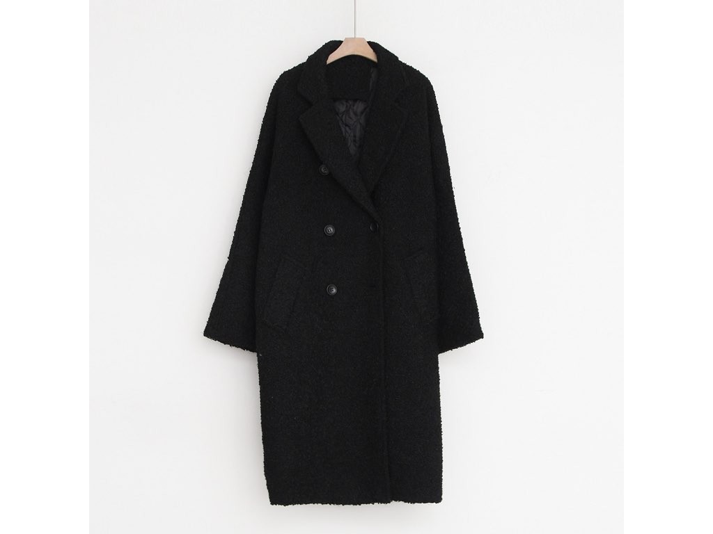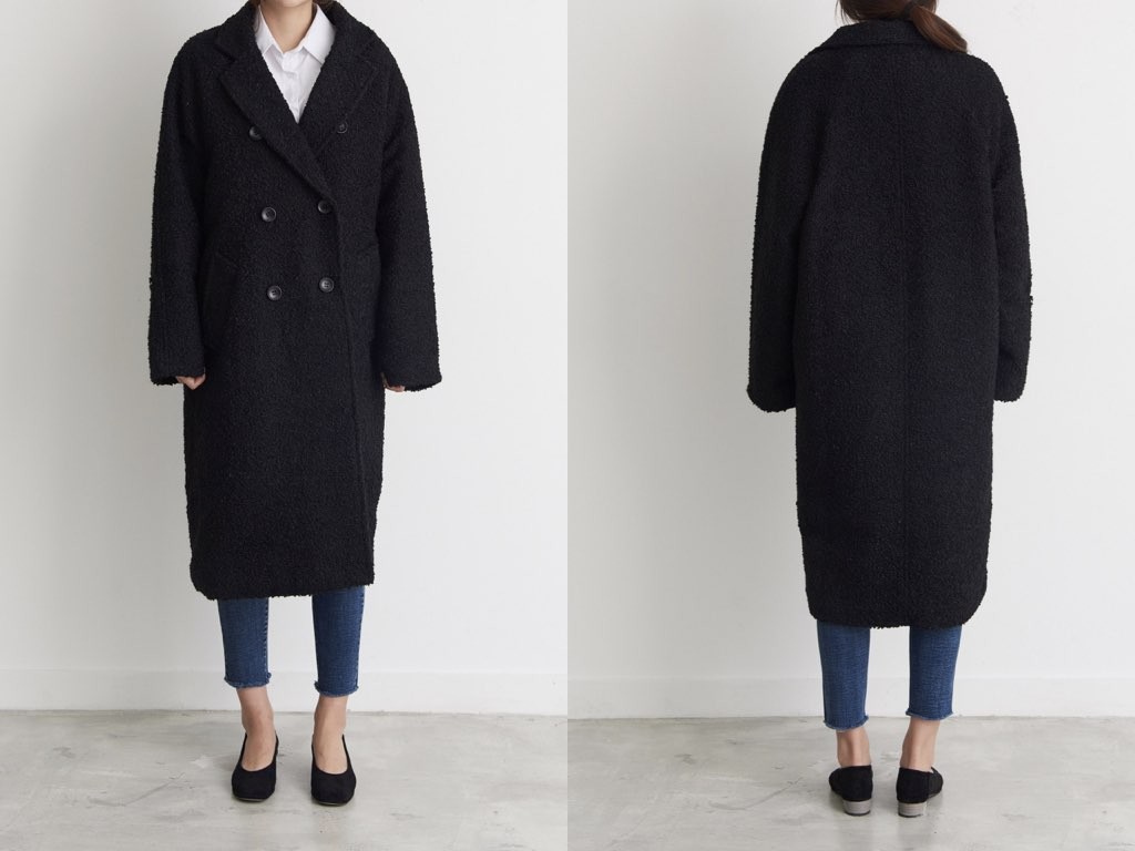 ダブルロングコートです。さらりと着流せる長め丈です。(163cmのモデル着用で、膝下丈です)ウール、ポリエステル素材で伸縮性があります。裏地もあり、通勤スタイル、休日スタイルと幅広く利用することができます。さらりと着ることができて、これ一枚で旬な着こなしが実現しますね。1.基本情報色:ブラックサイズ:Free素材:ウール20%、ポリエステル80%製造国:Korea2.サイズ情報肩幅:ナグランデザイン身幅(胸断面):59cm 腕の長さ:71cm 着丈(前):107cm (サイズは計る方法に応じて±2〜3cmの誤差があります。ご了承お願い致します)モデル着用サイズ:F※着用モデル(163cm、体重47kg、足のサイズ24.5cm)3.その他の情報厚み:厚い透け感:なし伸縮性:あり裏地:あり洗濯方法:ドライ(クリーニング)[注意事項]お取り寄せ商品は、海外より仕入れるため納品まで約10日前後いただきます。また店舗でも販売しており、在庫切れになる場合もございます。ご了承お願い致します。