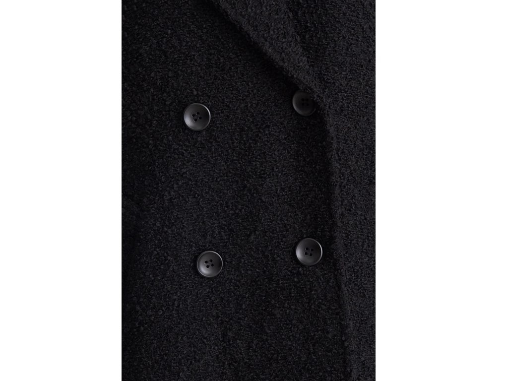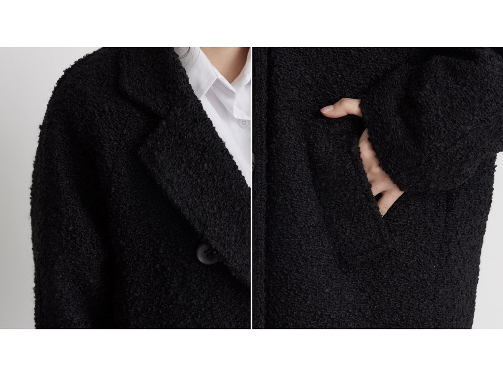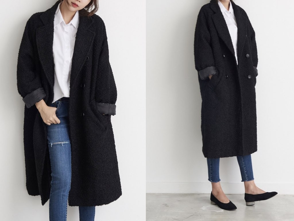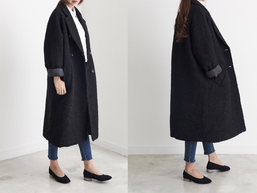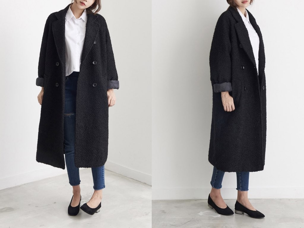 ダブルロングコートです。さらりと着流せる長め丈です。(163cmのモデル着用で、膝下丈です)ウール、ポリエステル素材で伸縮性があります。裏地もあり、通勤スタイル、休日スタイルと幅広く利用することができます。さらりと着ることができて、これ一枚で旬な着こなしが実現しますね。1.基本情報色:ブラックサイズ:Free素材:ウール20%、ポリエステル80%製造国:Korea2.サイズ情報肩幅:ナグランデザイン身幅(胸断面):59cm 腕の長さ:71cm 着丈(前):107cm (サイズは計る方法に応じて±2〜3cmの誤差があります。ご了承お願い致します)モデル着用サイズ:F※着用モデル(163cm、体重47kg、足のサイズ24.5cm)3.その他の情報厚み:厚い透け感:なし伸縮性:あり裏地:あり洗濯方法:ドライ(クリーニング)[注意事項]お取り寄せ商品は、海外より仕入れるため納品まで約10日前後いただきます。また店舗でも販売しており、在庫切れになる場合もございます。ご了承お願い致します。