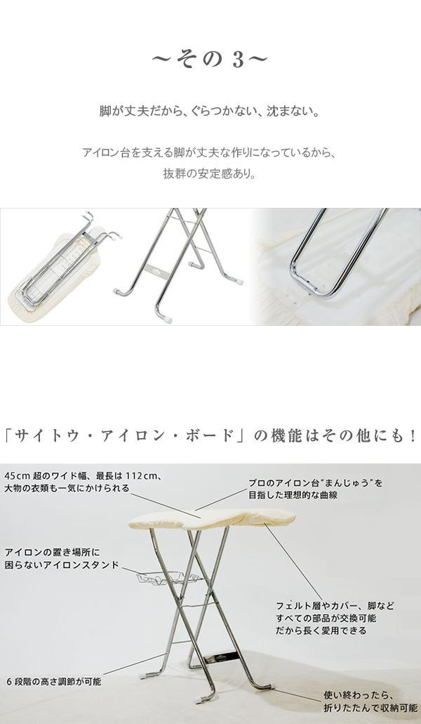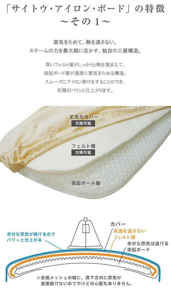 | 素材・材質 | 本体:ポリエチレン フェルト:ポリエステル 脚:スチール(クロームメッキ) 脚部キャップ:硬質ゴム アイロン置台:スチール カバー:綿 |