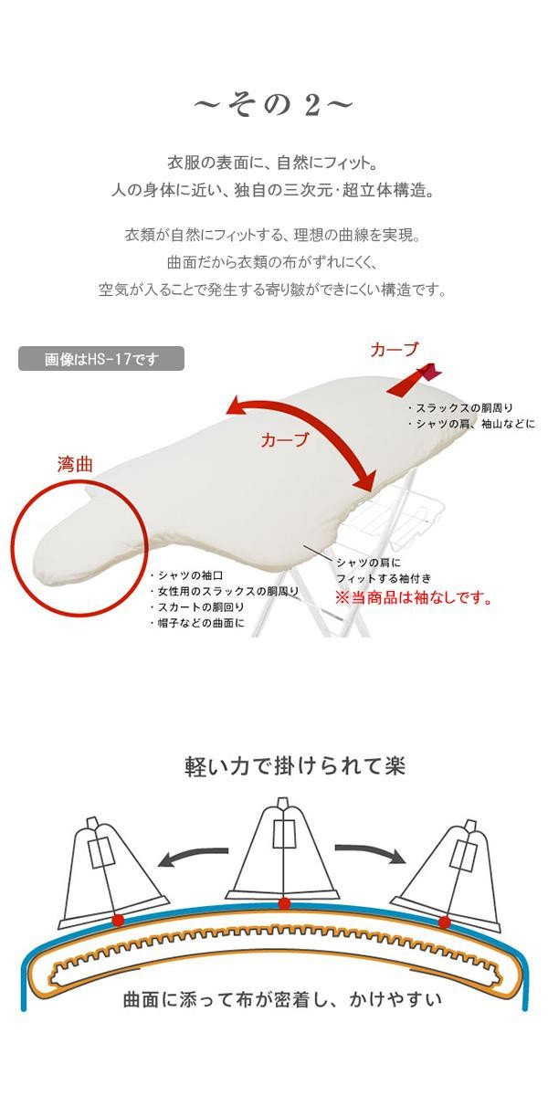 | カーブした表面に、先端部の湾曲が付いたスタンダードタイプのアイロン台。高さが6段階で調節できるので、椅子に腰かけてのアイロンも楽になります。アイロンが置ける便利なスタンド付き♪ |